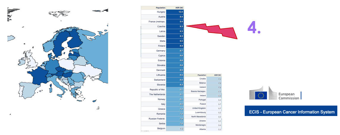 Mapa: Incidence rakoviny slinivky v rámci Evropy