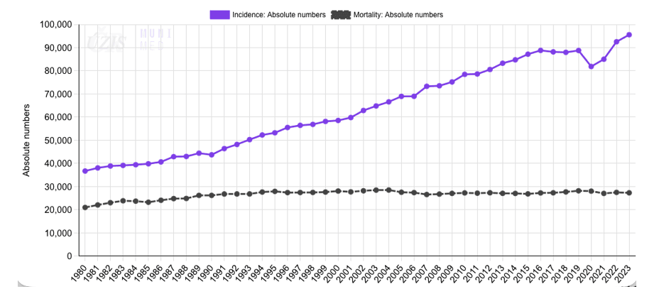 Graf 1: Incidence a mortalita rakoviny slinivky v České republice (zdroj: https://www.svod.cz/incidence-mortality)