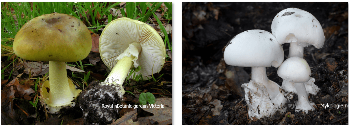 Obrázek 12: Houby způsobující hepatorenální (phalloidní) syndrom (zleva Amanita phalloides umbrina – muchomůrka hlízovitá zelená, Amanita phalloides alba – muchomůrka hlízovitá bílá) / užito z přednášky MUDr. Jiřího Valenty