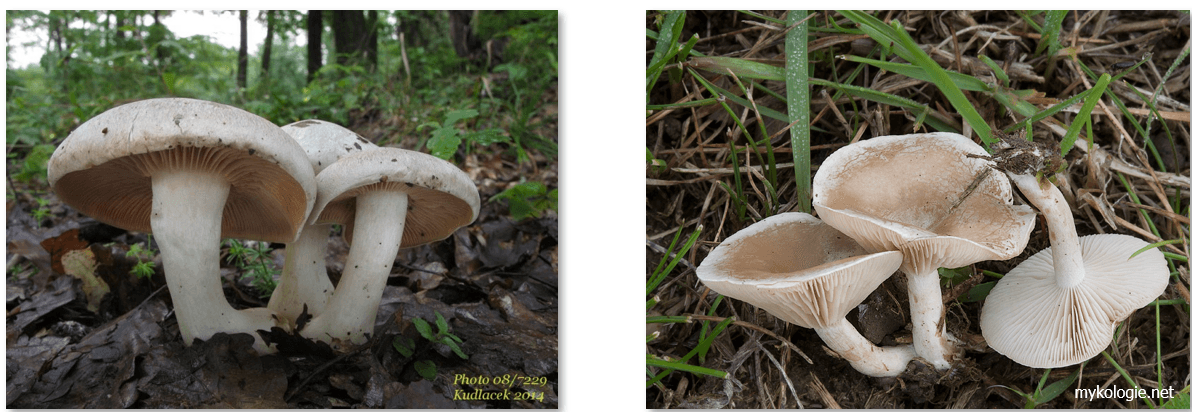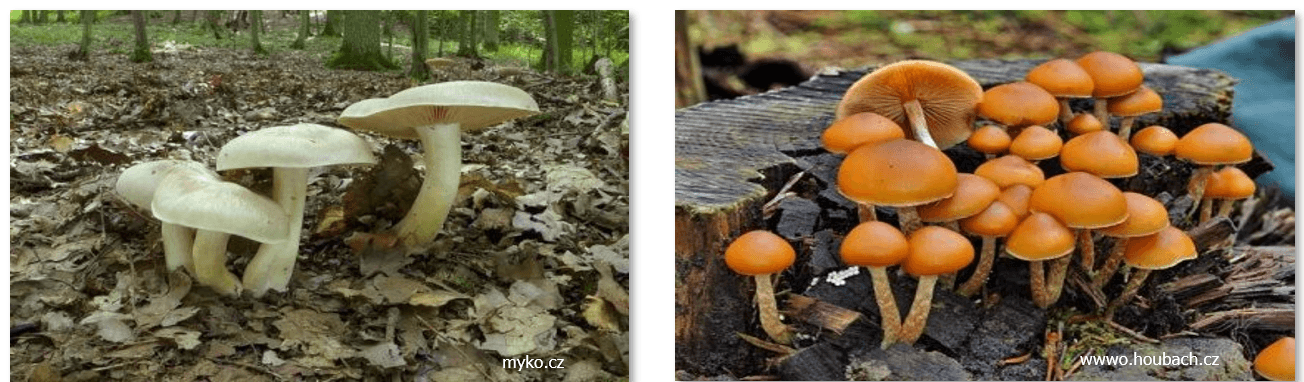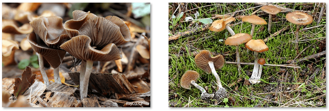Obrázek 9: Houby způsobující muskarinový syndrom (zleva závojenka olovová, čirůvka límečková) / užito z přednášky MUDr. Jiřího Valenty