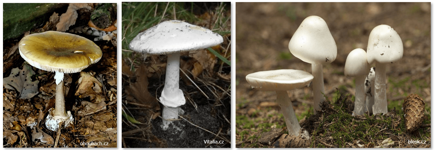 Obrázek 4: Smrtelně jedovaté houby (zleva muchomůrka hlízovitá, zelená a bílá forma, muchomůrka jarní) / užito z přednášky MUDr. Jiřího Valenty)