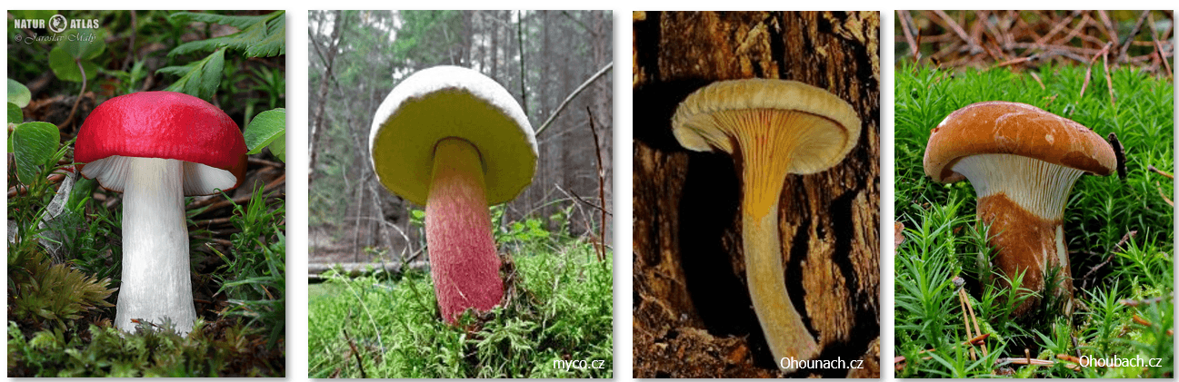 Obrázek 1: Nejedlé houby (zleva: holubinka vrhavka, hřib kříšť, lištička pomerančová, čechratka černohuňatá) / užito z přednášky MUDr. Jiřího Valenty.