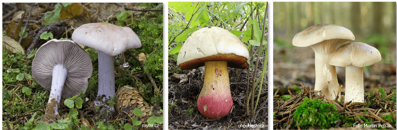 Obrázek 5: Houby způsobující gastroenterodyspeptický syndrom (zleva čirůvka fialová, hřib satan, strmělka mlženka) / užito z přednášky MUDr. Jiřího Valenty)