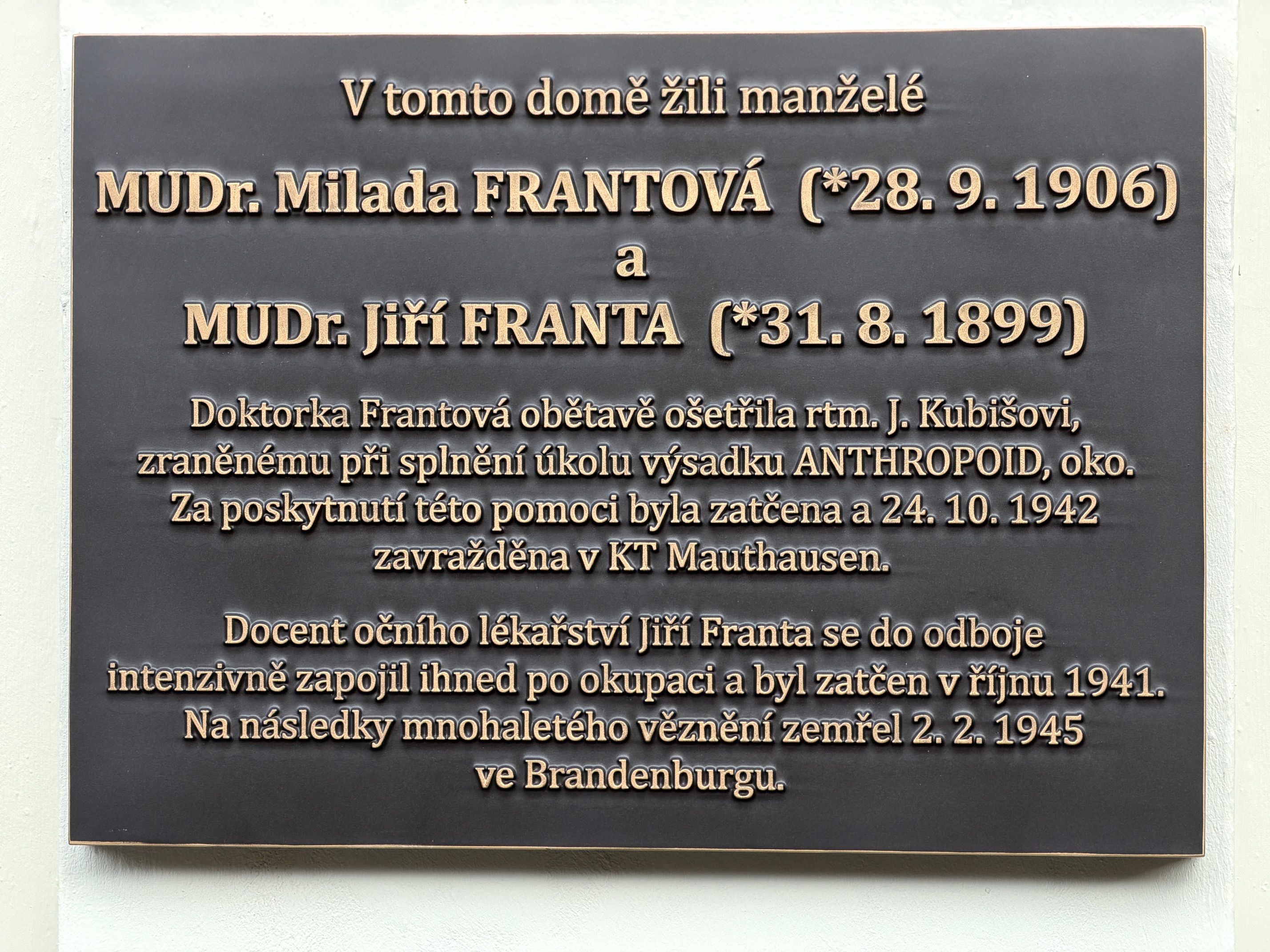 Pamětní deska MUDr. Miladě Frantové a doc. MUDr. Jiřímu Frantovi, hrdinům protinacistického odboje, byla odhalena v sobotu 26. 10. 2025. MUDr. Milada Frantová (*28. 9. 1906) a její manžel doc. MUDr. Jiří Franta (*31. 8. 1899) byli členy odbojové organizace Petiční výbor Věrni zůstaneme (PVVZ).