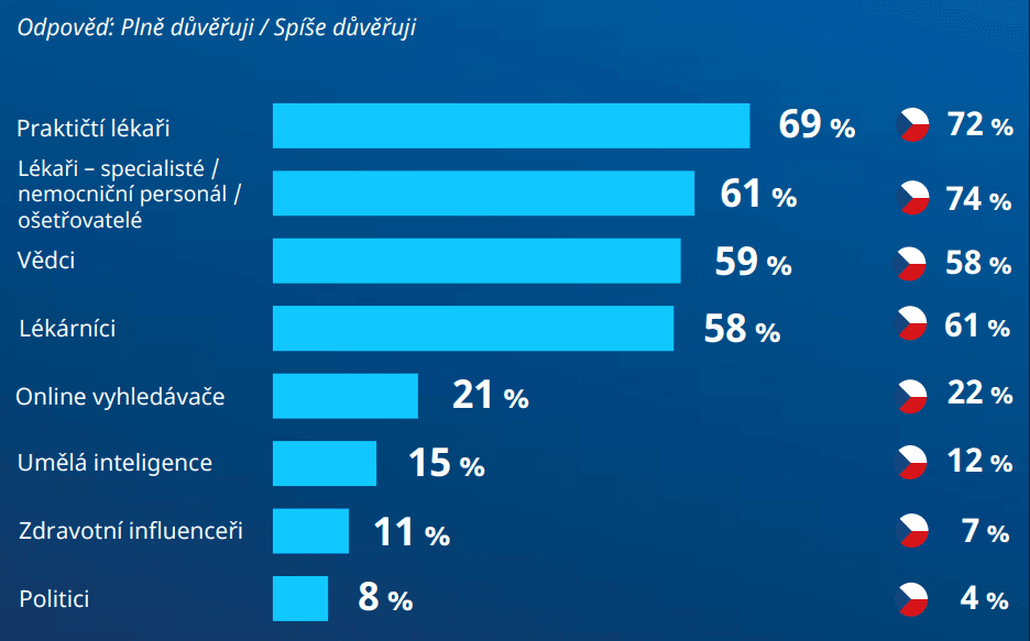 Navzdory všem výše uvedeným obavám a výtkám zůstává důvěra v jednotlivé aktéry zdravotních systémů vysoká. Mezi nejdůvěryhodnější osoby v oblasti zdraví se stále řadí praktičtí lékaři (69 %, ČR 72 %) a lékárníci (58 %, ČR 61 %), kteří mají výrazně vyšší důvěru než Google (20 %, ČR 22 %), umělá inteligence (15 %, ČR 12 %) či online zdravotničtí influenceři (11 %, ČR 7 %).