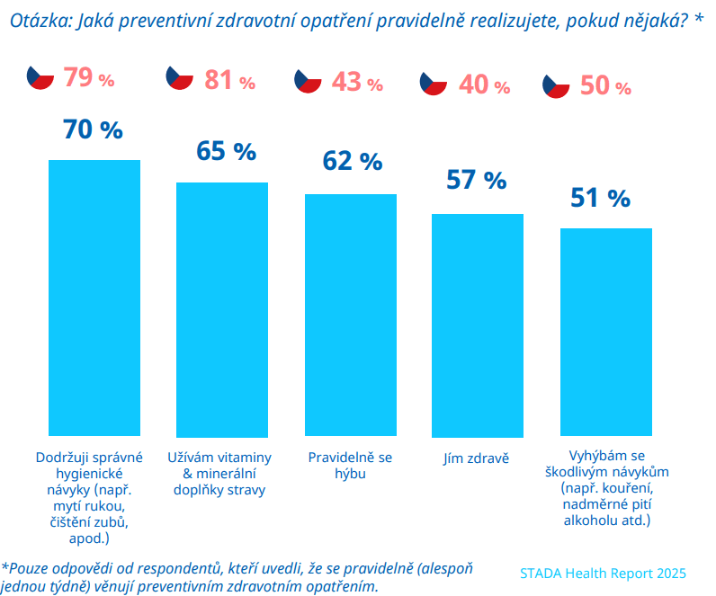 Kromě dodržování osobní hygieny je nejrozšířenějším preventivním chováním užívání doplňků stravy – nejčastěji pro podporu imunity, dodání energie nebo doplnění živin – zejména v Česku (81 %), Maďarsku (80 %) a na Slovensku (78 %).