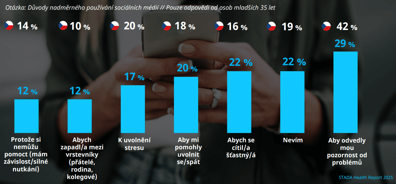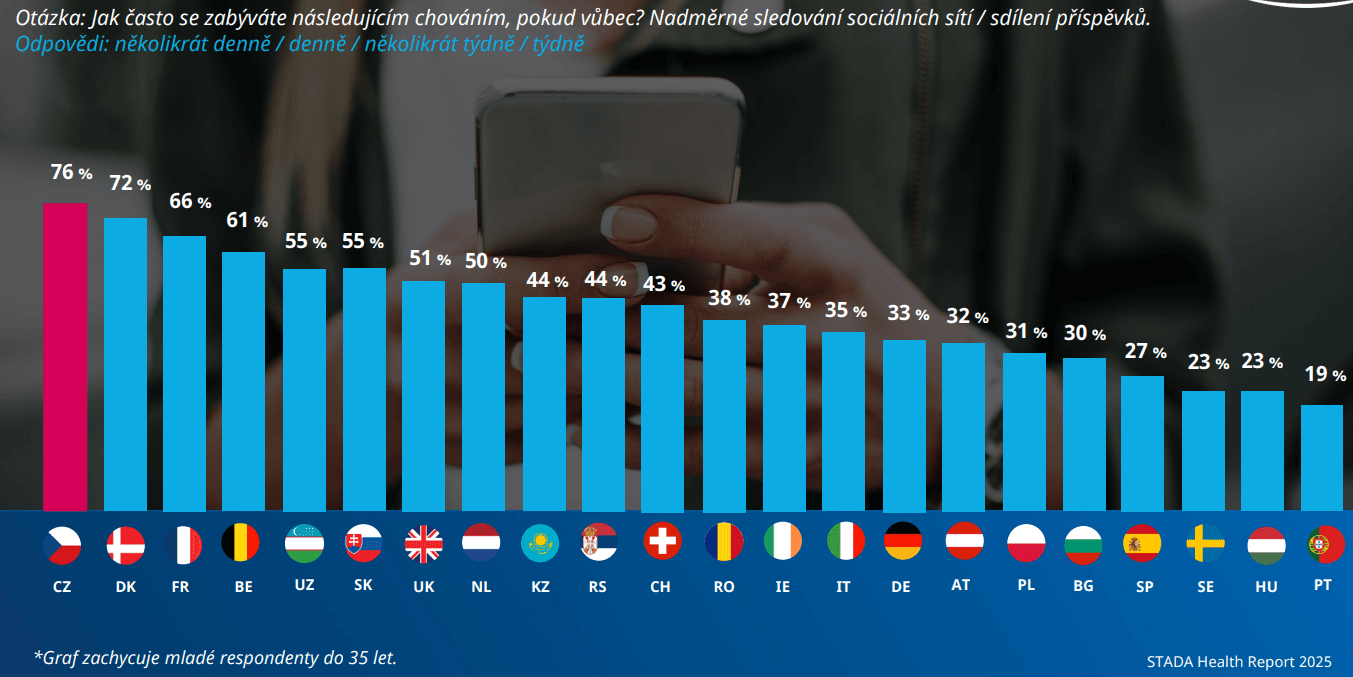 Celkem 92 % lidí v Česku se zajímá o zdravý životní styl. Není divu, jeho důležitost na nás skáče ze všech stran a lidé napříč Evropou se snaží dělat pro své zdraví čím dál více. Vědět, co je pro nás dobré, je ale jedna věc a řídit se tím v každodenním životě je věc druhá. Což ukazuje i nejnovější průzkum STADA Health Report 2025 provedený na vzorku 27 000 lidí z 22 evropských zemí s tím, že v každé zemi bylo 1000 až 2000 respondentů. Duševní relax navíc mladí lidé do 35 let hledají nejčastěji na sociálních sítích a v Evropě se řadí suverénně na první místo v jejich nadužívání.