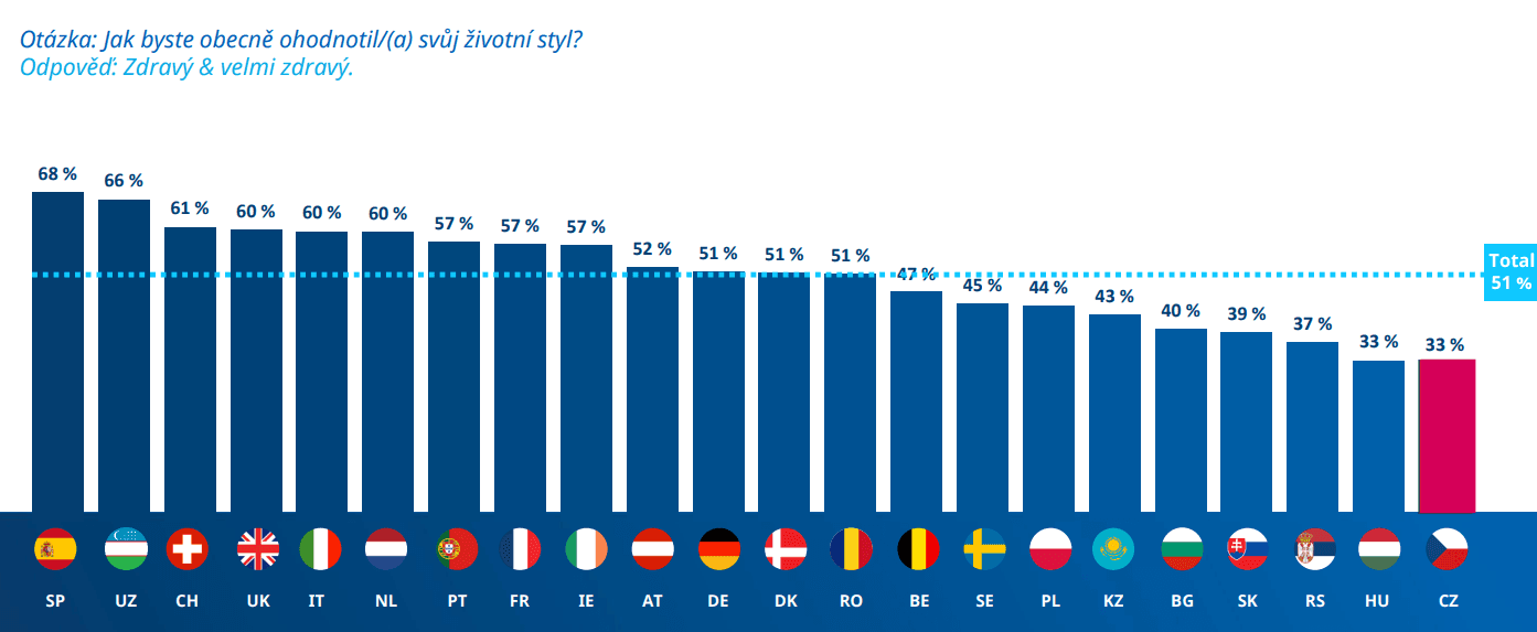Pouze polovina Evropanů (51 %) má pocit, že se jim dlouhodobě skutečně daří žít zdravý život. V Česku je to jen 33 %. Nejlépe hodnotí svůj životní styl Španělé (68 %). Jen 9 % Evropanů (ČR 15 %) o sobě říká, že žijí „nezdravě“.