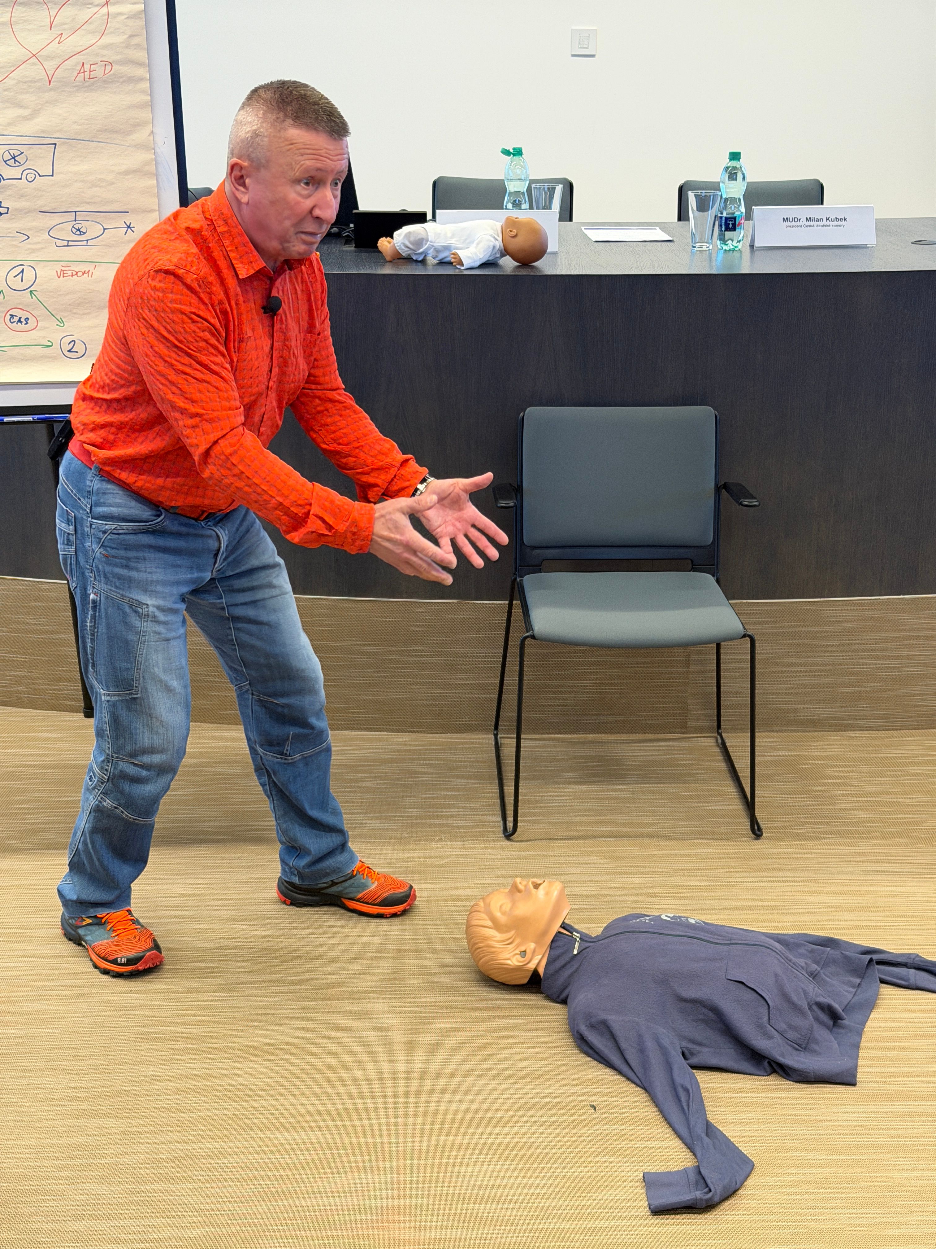 Ve své přednášce nejen poutavě přiblížil celý záchranný řetězec, ale také vysvětlil, jak správně komunikovat s dispečerem i s pacientem. Jak zjistit, zda ho něco bolí nebo zda je skutečně v bezvědomí a nedýchá, a nechyběl ani praktický nácvik resuscitace. Na závěr představil velmi zajímavé kazuistiky přímo z terénu, proto rozhodně doporučujeme zhlédnout celý videozáznam konference, který je k dispozici na webu ČLK a na konci tohoto článku. V tomto článku si shrneme alespoň zásadní body z přednášky.