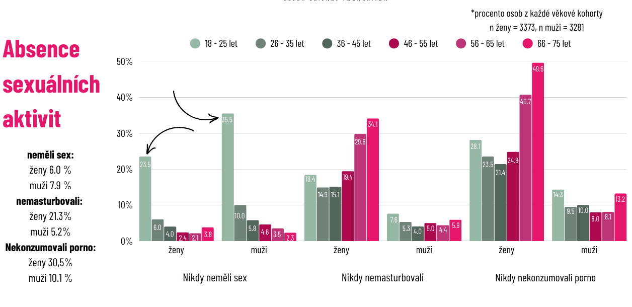 Zároveň se ukazuje, že část populace nemá sexuální zkušenost vůbec. „Nikdy nemělo sex 6 % žen a 7,9 % mužů, ale co bylo vlastně nejzajímavější, máme vzestup absence zkušenosti s periodickými sexuálními aktivitami v té nejmladší generaci,“ upozornila Klapilová[R2.1].