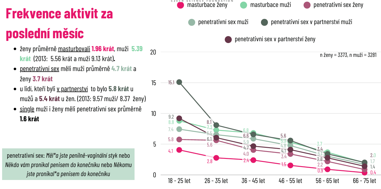 Jedním z nejvíce medializovaných zjištění je pokles frekvence sexuálních aktivit. Data potvrzují trend pozorovaný i v zahraničí – lidé mají méně sexu než dříve. V partnerství mají muži penetrativní sex průměrně 5,8krát měsíčně a ženy 5,4krát, což odpovídá zhruba jedné až dvěma sexuálním aktivitám týdně.