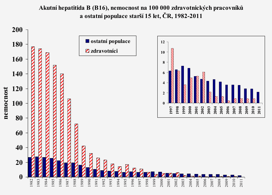 V grafu 1 lze vidět vývoj hepatitidy B v bývalém Československu a v České republice. Červeně šrafované sloupce znázorňují nemocnost akutní hepatitidy B na 100 000 zdravotnických pracovníků, ostatní populace je modře. Zdravotníci byli dříve v opravdu vysokém riziku onemocnění hepatitidou B a díky povinnému očkování zdravotnických pracovníků proti hepatitidě B se počet onemocnění postupně snížil na jednotky případů.