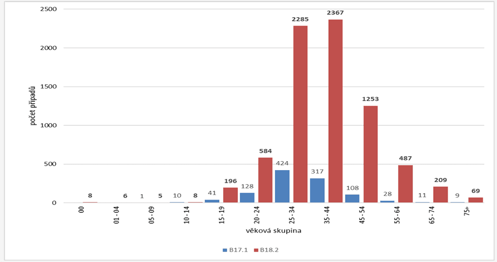 Při pohledu na graf 2 (chronická HCV – červené sloupce, akutní HCV – modré sloupce) se případy vyskytují nejčastěji ve věku 15 až 19 let, kdy se začíná jak s drogovým, tak sexuálním experimentováním.