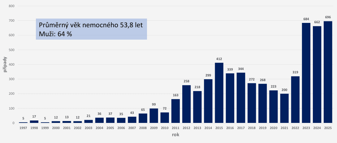 Graf 3: Vývoj počtu případů VHE v ČR v letech 1996–2025* (ISIN/EPIDAT)