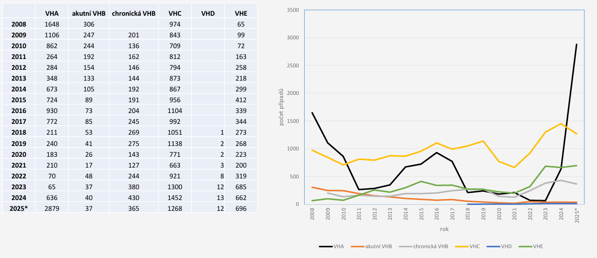 Tabulka 2: Virové hepatitidy a ČR, 2008–2025* (ISIN, EPIDAT)