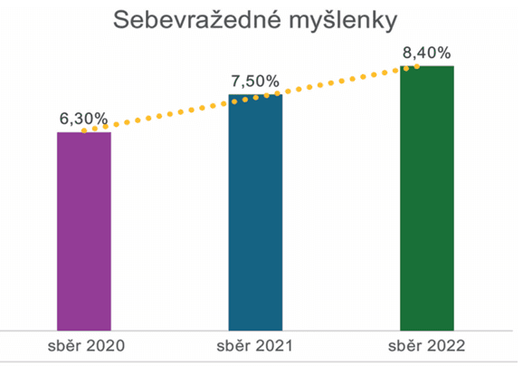 Ve všech vlnách sběru dat byly dotazy na pasivní a aktivní myšlenky na sebevraždu pomocí dvou položek validované škály (The Columbia-Suicide Severity Rating Scale). Na rozdíl od poklesu zátěže i depresivních příznaků zde vidíme stálý vzestup (viz graf 1), který pravděpodobně odráží kumulativní zátěž individuální, pracovní i geopolitickou. V posledním období v roce 2022 byl zaznamenán i mírný nárůst počtu osob s aktivními suicidálními myšlenkami.