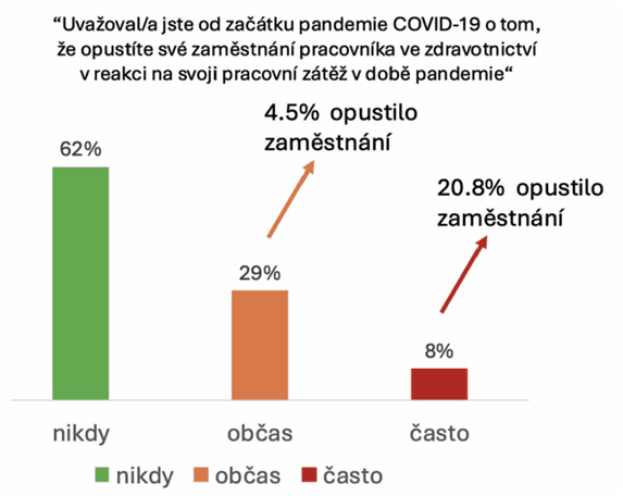 V posledním roce sběru dat jsme se zaměřili i na úvahy o opuštění stávajícího zaměstnání nebo dokonce odchodu ze zdravotnictví v důsledku pracovní zátěže spojené s pandemií. Od jejího počátku tyto úvahy připustila více než třetina respondentů (37 %). Z těch, kteří uvedli, že o této možnosti uvažovalo „občas“, skutečně odešlo 4,5 %, zatímco pokud byly úvahy o odchodu časté, zaměstnání opustilo 21 % (viz graf 2). Je zjevné, že zvýšená pracovní zátěž s kumulací stresorů může mít v důsledku velice negativní dopady na celý systém poskytování zdravotní péče.