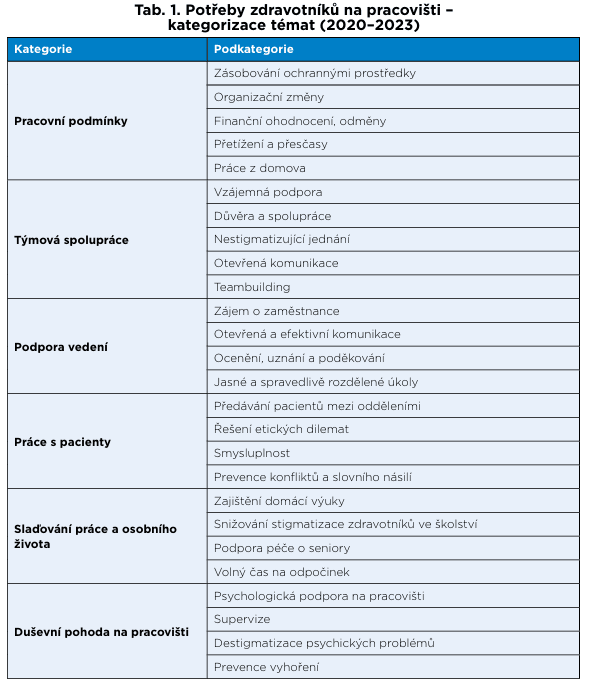 Dalším zdrojem byla kvalitativní data intervenční studie. Zde jsme použili cílenější sadu otázek, které byly zaměřené na zjištění konkrétních potřeb účastníků v pracovním kontextu. Otázky se týkaly očekávání a potřeb vůči vedení, kolegům a systému obecně. Celkem jsme získali 1223 odpovědí (1105 z dotazníků a 118 od účastníků intervenční studie). Použili jsme přístup obsahové analýzy, po vytvoření kódovacího schématu byla data kódována v programu Atlas.ti. Kódy byly následně roztříděny do kategorií. Hlavních kategorií bylo šest (pracovní podmínky, týmová spolupráce, podpora vedení, práce s pacienty, slaďování práce a osobního života a potřeby spojené s duševní pohodou na pracovišti) a každá z nich obsahovala ještě