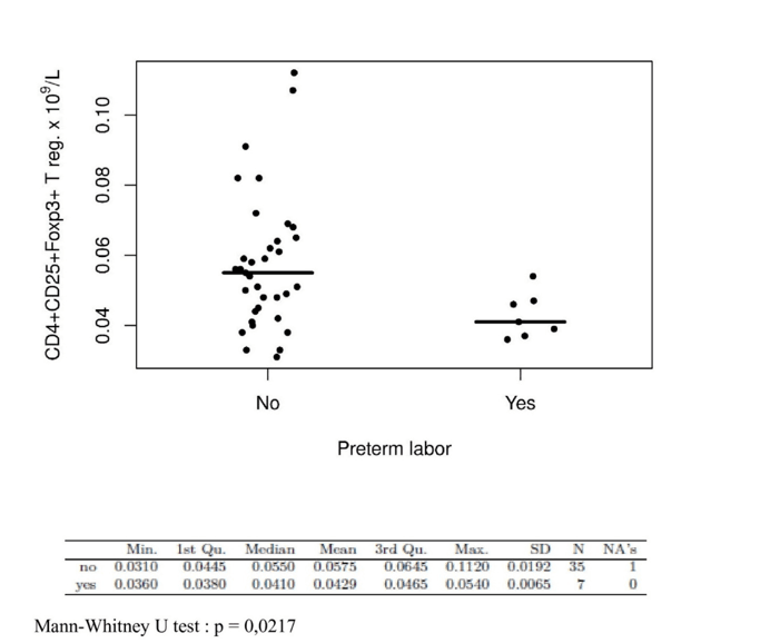 Graf 1: Prvotrimestrální počty T regulačních lymfocytů (10.–12. týden), následný předčasný porod (ne/ano), studie Reduced number of regulatory T cells in maternal circulation precede idiopathic sponateous preterm labor in a subset of patients.