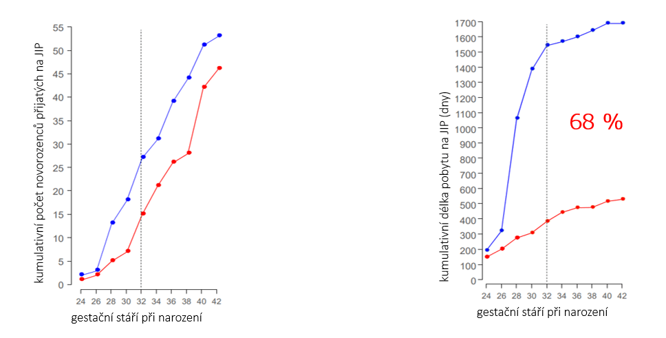 Novorozenci, jejichž maminky dostaly placebo, se rodili významně dříve než novorozenci maminek, které braly aspirin, protože u nich se preeklampsie rozvinula až v pozdější fázi těhotenství. Včasné nasazení léčby má vliv také na kumulativní počet dnů pobytu na jednotce intenzivní péče, což znázorňuje graf 2, kdy modrá křivka znázorňuje novorozence narozené maminkám beroucím placebo a červená křivka novorozence maminek užívajících aspirin.