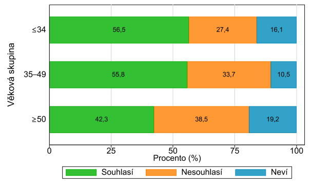 Graf 1: Podíly respondentů vyjadřujících stanovisko k tvrzení, že lidé žijící s HIV, kteří jsou na účinné léčbě a mají nezjistitelnou virovou nálož, nemohou virus přenášet sexuální cestou, podle věku (zdroj: Znalosti a postoje k HIV ve zdravotnických zařízeních v České republice, SZÚ).