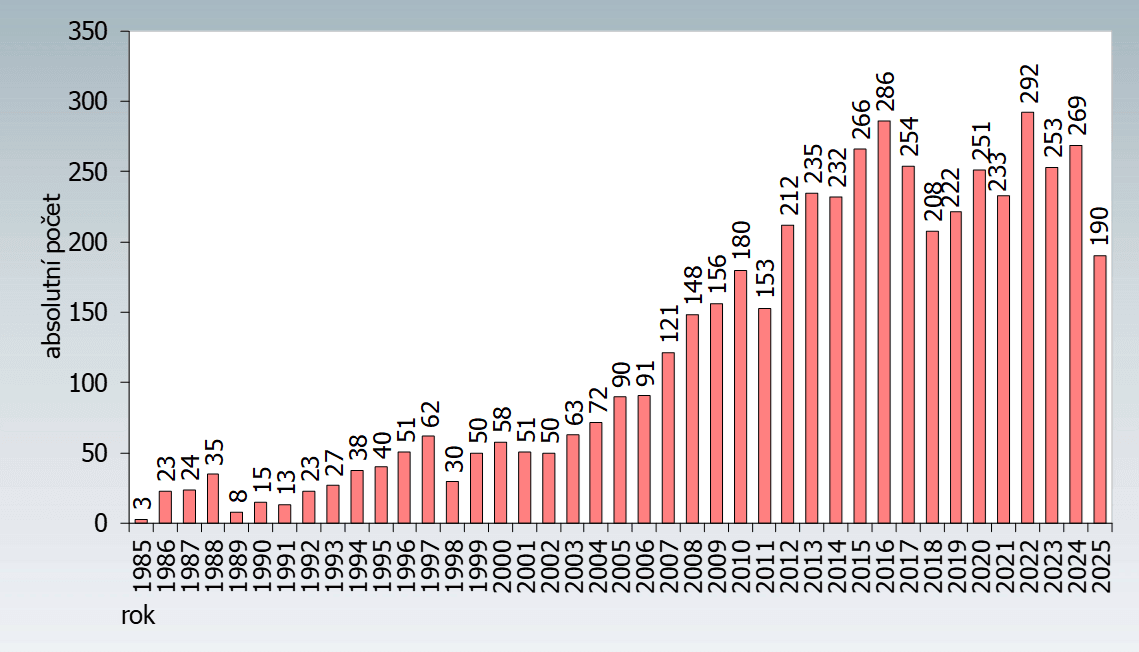 Graf 4: Nové případy infekce HIV v ČR v jednotlivých letech – občané ČR a cizinci s dlouhodobým pobytem ke dni 31. 8. 2025 (zdroj: SZÚ)