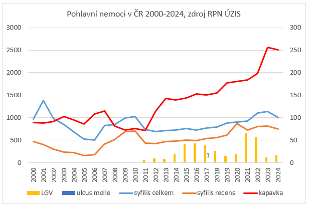Na druhé straně ve srovnání s jinými infekčními nemocemi, i když bylo dosaženo fenomenálního pokroku v antibakteriální a antivirové terapii, dosud s několika výjimkami (VHB, HPV) bohužel neexistuje podle ní účinné očkování, které by bylo schopné STI eradikovat. Výskyt nejvýznamnějších bakteriálních STI (syfilis, kapavky a infekce Chlamydia trachomatis) v ČR dynamicky roste od roku 2011 (graf 2).