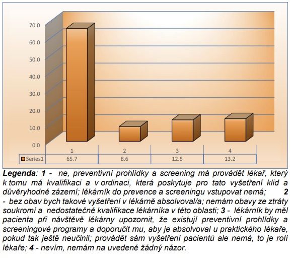 V oblasti prevence a screeningu je postoj pacientů ještě jednoznačnější. Celkem 65,7 % respondentů uvedlo, že preventivní prohlídky a screening má provádět lékař v ordinaci. Pouze 8,6 % by bez obav absolvovalo preventivní vyšetření v lékárně. 12,5 % je toho názoru, že lékárník by měl pacienta alespoň upozornit na existenci preventivních programů a doporučit mu jejich absolvování u praktického lékaře. Přibližně 4 % nemají názor.