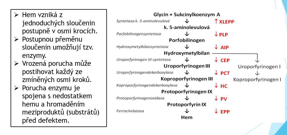 Tabulka a graf: Vznik (syntéza) hemu v buňkách (zdroj: přednáška prof. doc. MUDr. Jana Šperla, CSc.)